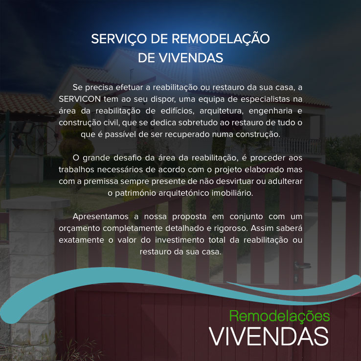 A Servicon é especialista em remodelação, restauro casas e decoração de casas e espaços comerciais. Fazemos remodelações de interiores e exteriores.